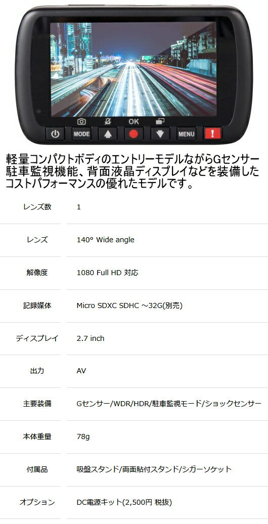 軽量コンパクトボディのエントリーモデルながらGセンサー、駐車監視機能、背面液晶ディスプレイなどを装備したコストパフォーマンスの優れたモデルです。