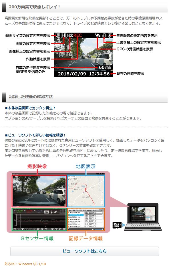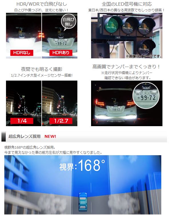 ■ 仕 様 ■ ■駐車場監視機能 ■全国のLED信号に対応 ■HDR/WDR搭載で白飛びなし! ■ノイズ対策済み ■1/2.7インチ大型イメージセンサー搭載! ■GPS搭載 運行管理ソフト有り ※製品3年保証、2万円保証サービス 付属品:電源ケーブル、駐車監視・直接配線ユニット、取り付けステー、両面テープ、シガープラグコード、ステッカー、microSDカード(8GB)
