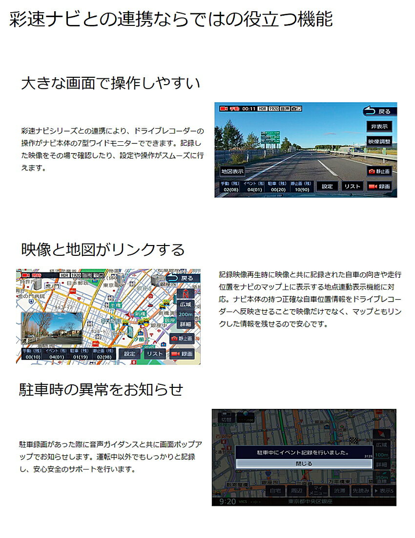 【仕 様】 ■ 仕 様 ■ 対応機種: MDV-M805L/705W/705 MDV-Z904W/MDV-Z904/MDV-Z704W/MDV-Z704 MDV-L504W/MDV-L504/MDV-L404W/MDV-L404 MDV-D504BTW/MDV-D504BT/MDV-D404BTW/MDV-D404BT/MDV-D304W/MDV-D304/MDV-D204BT/MDV-D204 モニターサイズ:カーナビゲーションのモニターを共有 撮像素子:1/3型400万画素 CMOS 記録解像度(最大):2304×1296(動画最大約298万画素) 映像ファイル形式: 動画:H.264(リニアPCM) 静止画:JPEG準拠(最大2304×1296) 電源電圧:14.4V(動作電圧範囲:8.5〜16V) GPS:カーナビゲーションのGPS情報を共有 Gセンサー:○ -4.0G〜+4.0G(0.1G単位) 動作温度範囲:-10℃〜+60℃ 外形寸法:幅79×高さ22/66×奥行48mm(ブラケット装着時) 質量:約75g ケーブル長:約3.5m 付属品:取り付けブラケット、シガープラグコード、microSDカード(8GB)